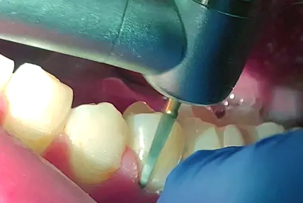تکنیک: برداشتن اولیه چسب: فرز Mr. Bur Finishing Taper Round End Tungsten Carbide با استفاده از یک حرکت سبک و جاروب کننده روی سطح دندان اعمال می شود. انتهای گرد آن، پرداختی صاف و دقیق را بدون برش در مینای دندان تضمین می کند، در حالی که شکل مخروطی آن امکان دسترسی بهتر به اطراف خطوط دندان را فراهم می کند. این مرحله، بخش عمده ای از چسب، بویژه نواحی بزرگتر، را با دقت کنترل شده ای حذف می کند.